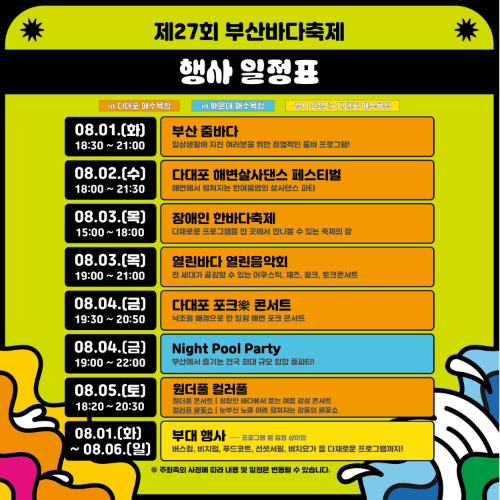 부산 해운대해수욕장과 다대포해수욕장 일원에서 개최되며, 부산바다에서 젊음을 만끽하고, 모두가 함께 즐길 수 있는 다양한 프로그램과 함께 참여하고 즐길 수 있습니다.