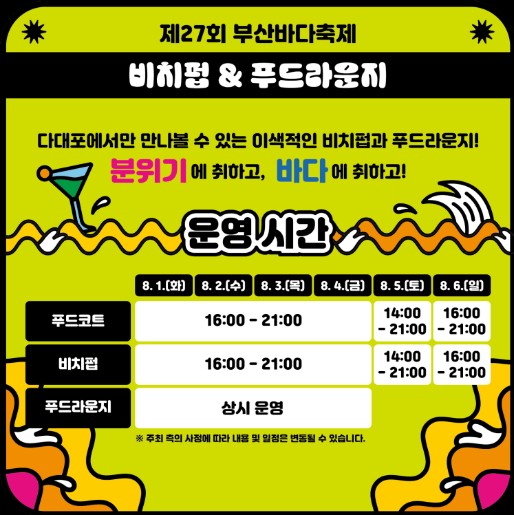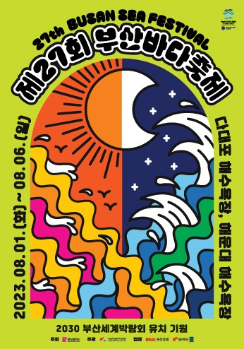 2023년 제27회 부산바다축제 부산의 여름을 대표하는 부산바다축제입니다. 전국 최대규모로 다양한 행사가 진행되는, 부산 바다 축제는 2023년 8월 1일부터 부산문화관광축제조직위원회주관으로, 부산시 다대포 해수욕장, 해운대 해수욕장 일원에서 진행됩니다.